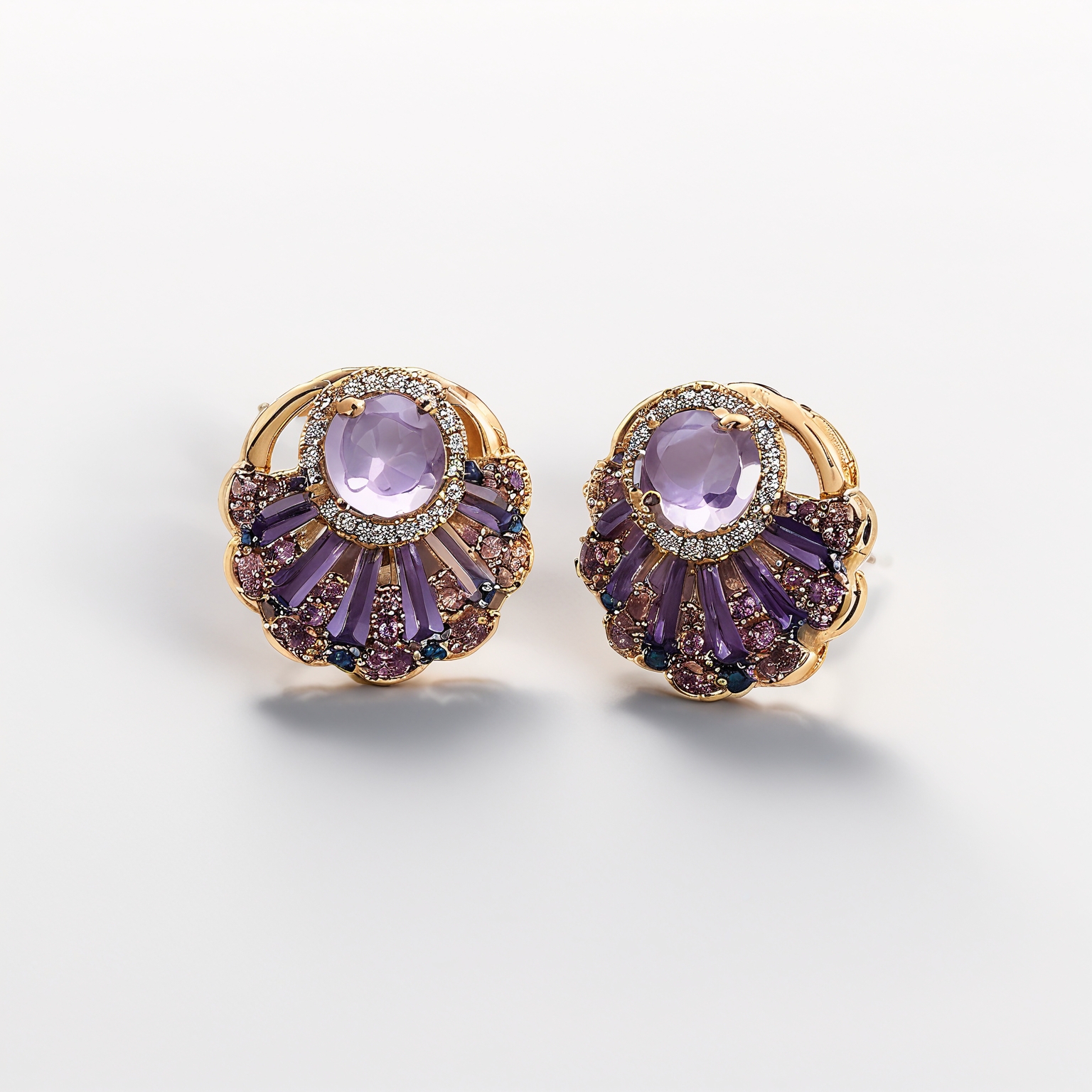 Elegant fan-shaped earrings with amethyst and pink gemstones.
